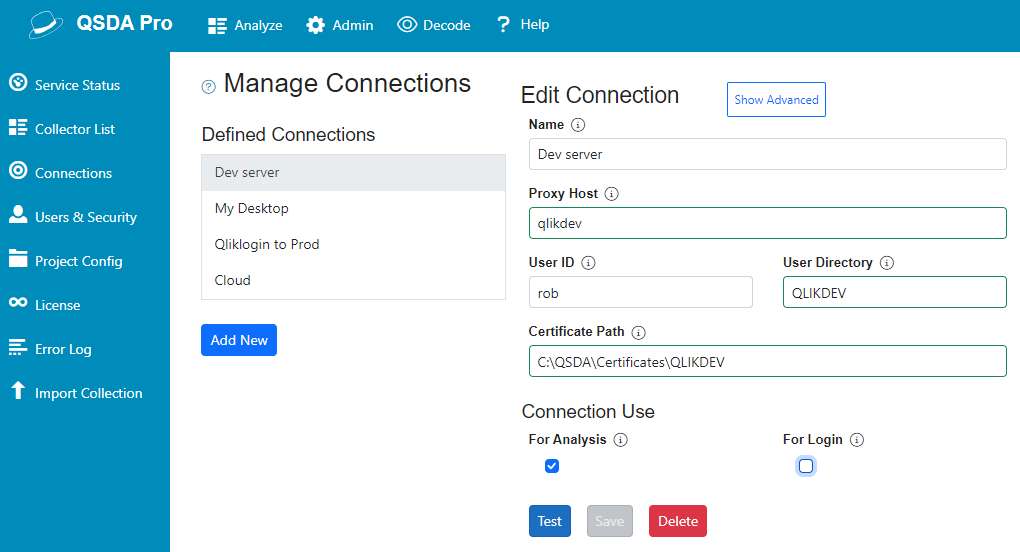 Use the Connections page to define a configure the connection to your Qlik Sense server(s).