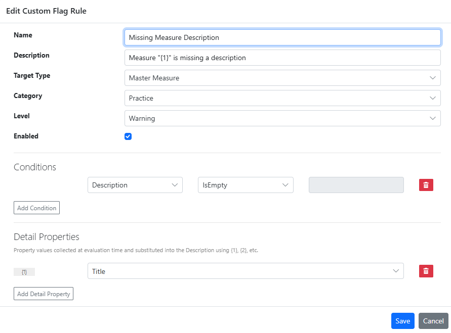 You want to enfore a company policy that all Master Measures should have a description. Raise a flag for any Master Measure that has an empty description property.