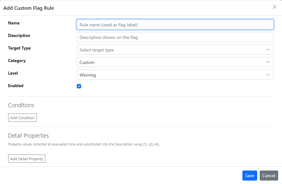 The Custom Flag Rules page allows for the definition of Flags that are specific to and tailored for your organization.