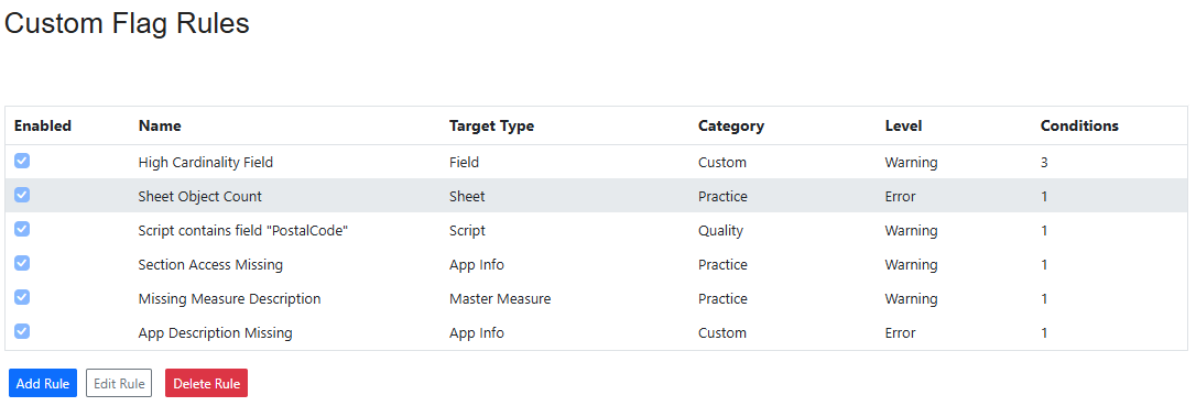 Selecting an existing Flag in the list will display the Edit Rule and Delete Rule buttons.