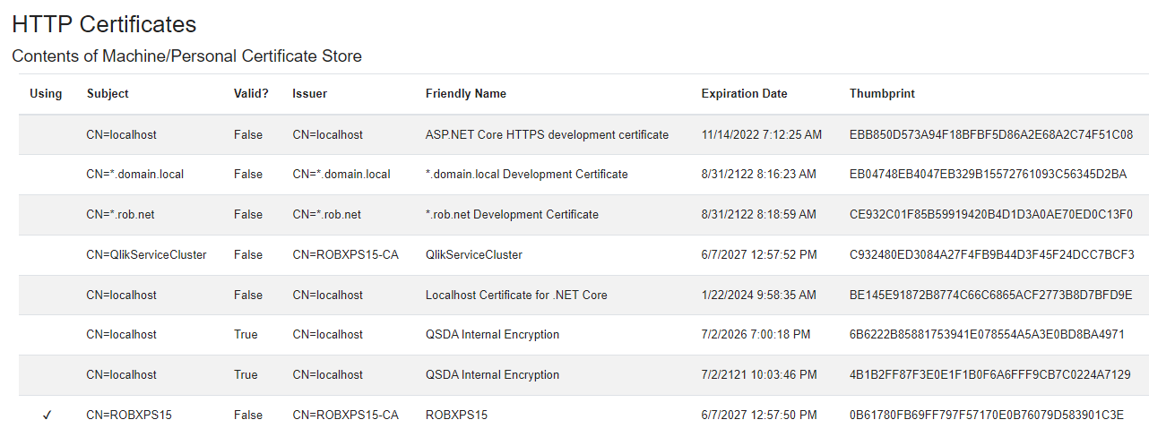 The SSL Certificates tab lists the certificates in the Local Machine/Personal store. If you access the page using https, the certificate QSDA uses is marked with a check in the "Using" column.