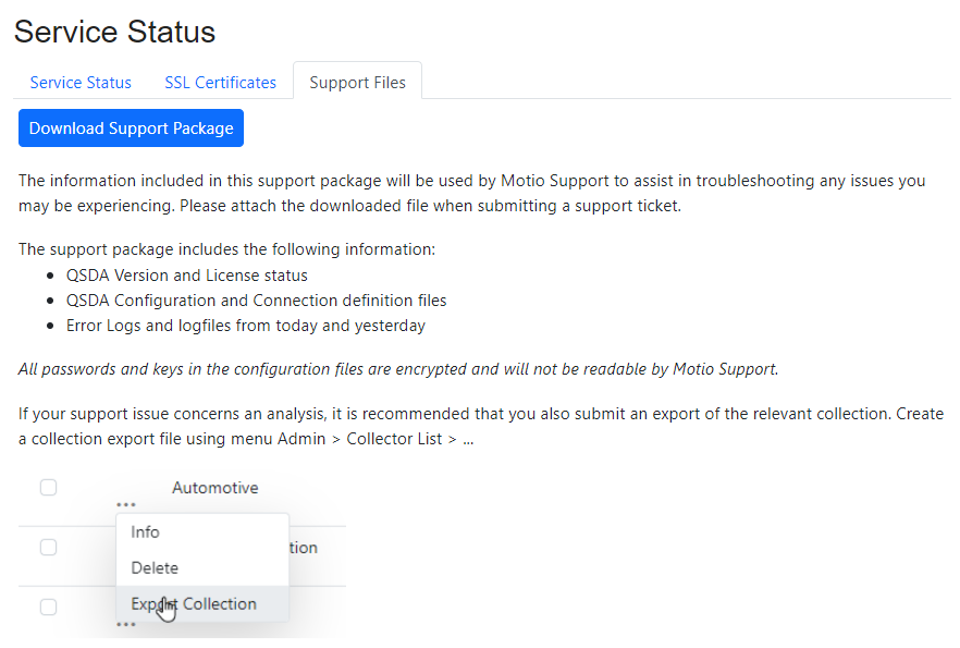 Use the Support Files tab to generate documentation for support cases. Click the "Download Support Package" button to create a zip file for the support team.