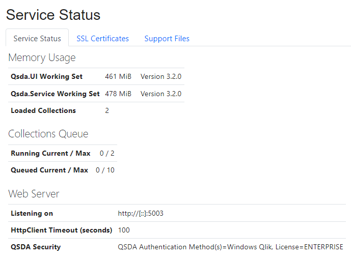 AdminService StatusService StatusService StatusThe Service Status screen shows the current configuration and memory consumption of the QSDA server.