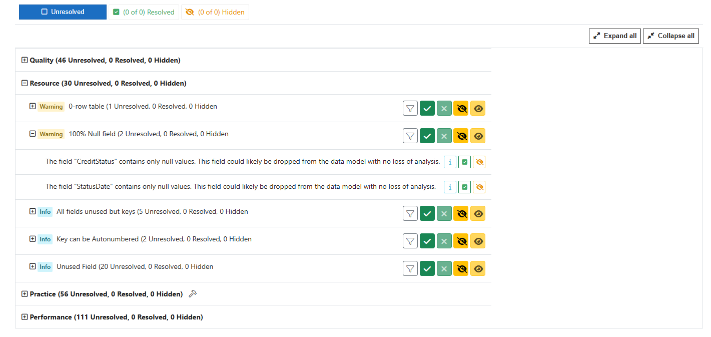 - Description -- e.g. "Table "CreditStatus" contains zero rows. It could likely be dropped from the data model with no loss of analysis."