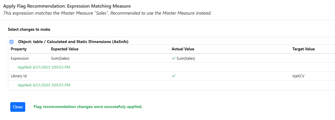 After you apply a recommendation, the Flag instance is marked as "Resolved". In the Flag Detail pane, the button changes to an Undo link.