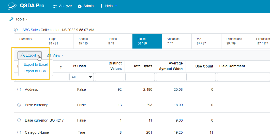 Each resource grid page provides an export menu for exporting grid contents in Excel or CSV format. The output reflects the current filtering and sort order.