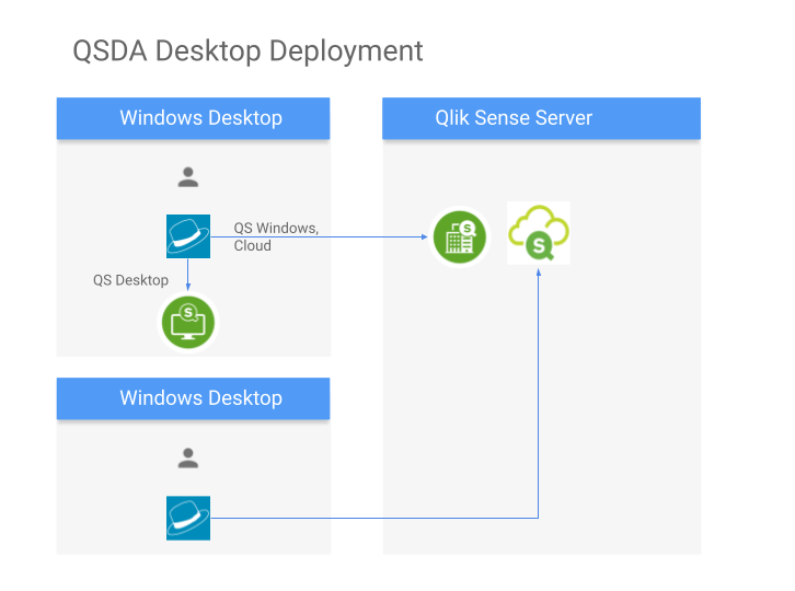 Install QSDA on one or more Windows 10 machines for individual use. Each user defines their own QS Server connection. Users do not share analyses.