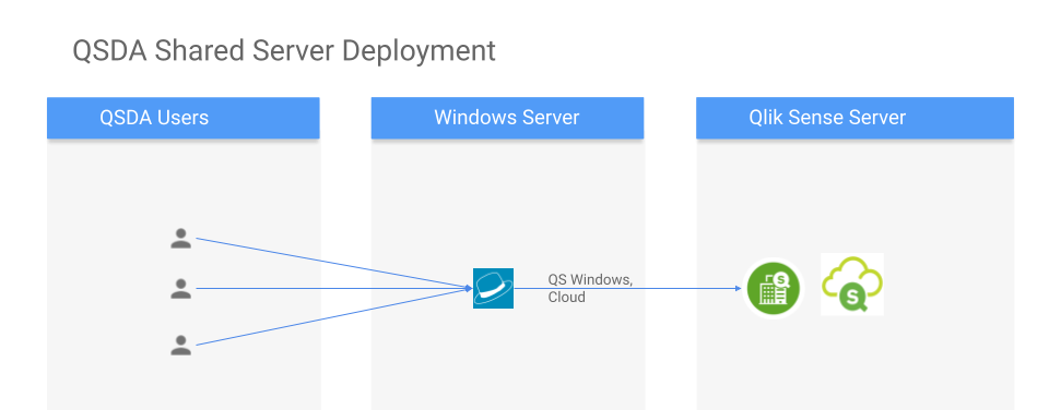 Install QSDA on a Windows Server for shared use by multiple users. You define one QS Server connection for all users. Users share analyses in a common repository. This deployment requires a QSDA Pro Enterprise license.