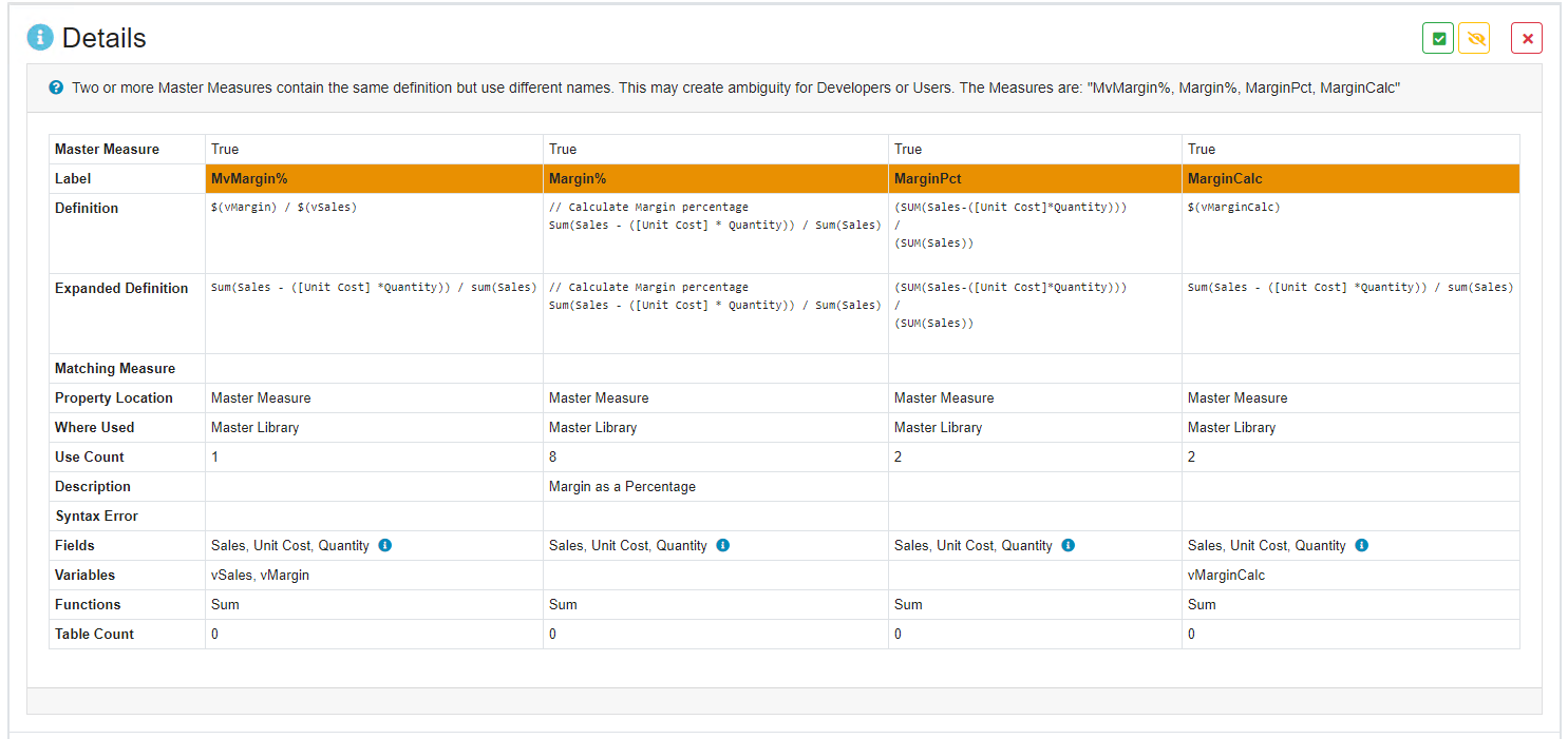 Two or more Master Measures contain the same effective definition but use different names. This may create ambiguity for Developers or Users. The Measures are: "name1, name2"