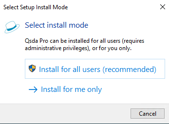 2. If this is your first time installing QSDA, the "Select Setup Install Mode" dialog appears. If QSDA Pro was previously installed, the installer skips this dialog and uses the previous option. To force this dialog to appear, uninstall QSDA first.