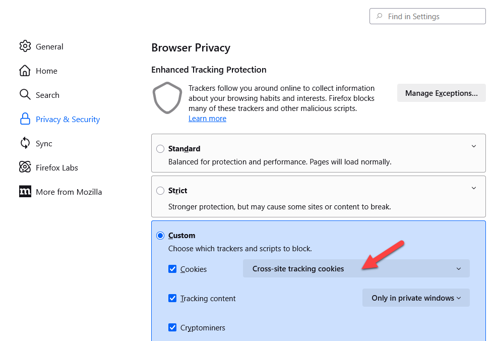 - If using Firefox, disable "Total Cookie Protection" as shown in this Firefox support article. Set the Custom Cookies property as shown in the image below.