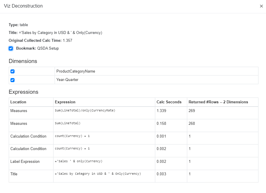 For some visualizations such as Treemap, the "Returned #Rows" count may differ from the original count reported by QSDA. This is because deconstruction processes the Expressions in "Straight" mode, whereas the visualization may use a different mode. The calculation results are still useful.